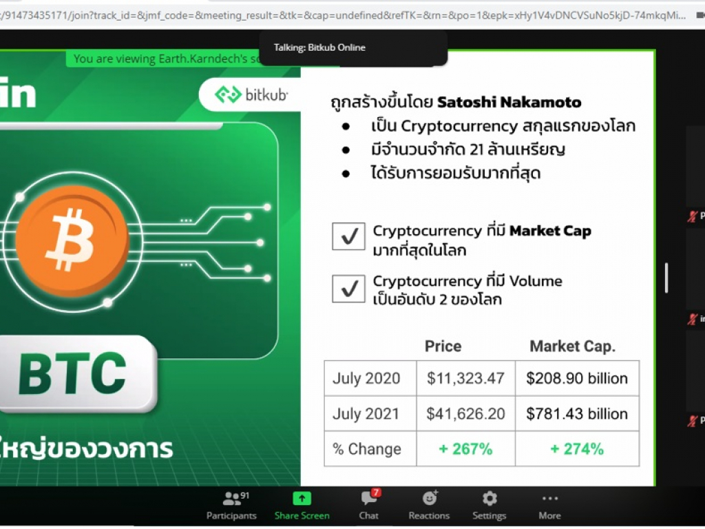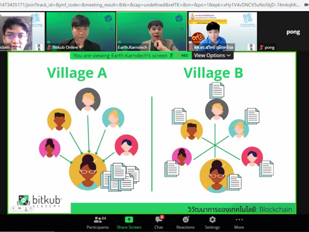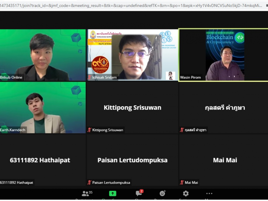 | "เมื่อวันพฤหัสบดี ที่ 3 มีนาคม 2565 สาขาวิชาวิศวกรรมซอฟต์แวร์และระบบสารสนเทศ คณะวิทยาศาสตร์และเทคโนโลยี สถาบันเทคโนโลยีปทุมวัน ร่วมกับ บริษัท บิทคับ ออนไลน์ จำกัด ได้จัดสัมมนาโครงการ พัฒนาหลักสูตรเฉพาะทางเรียนรู้ตลอดชีวิต ทุกช่วงวัย กิจกรรมหลักสูตรสัมมนาระยะสั้นเพิ่มทักษะ สร้างอาชีพ ในหัวข้อ BLOCKCHAIN & CRYPTOCURRENCY ปฏิวัติโลกยุคดิจิตอล ผ่านช่องทาง ZOOM Cloud Meetings
